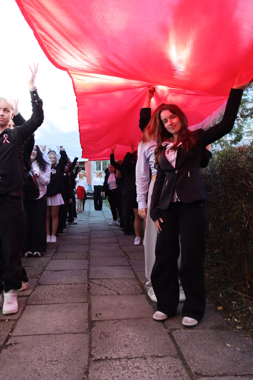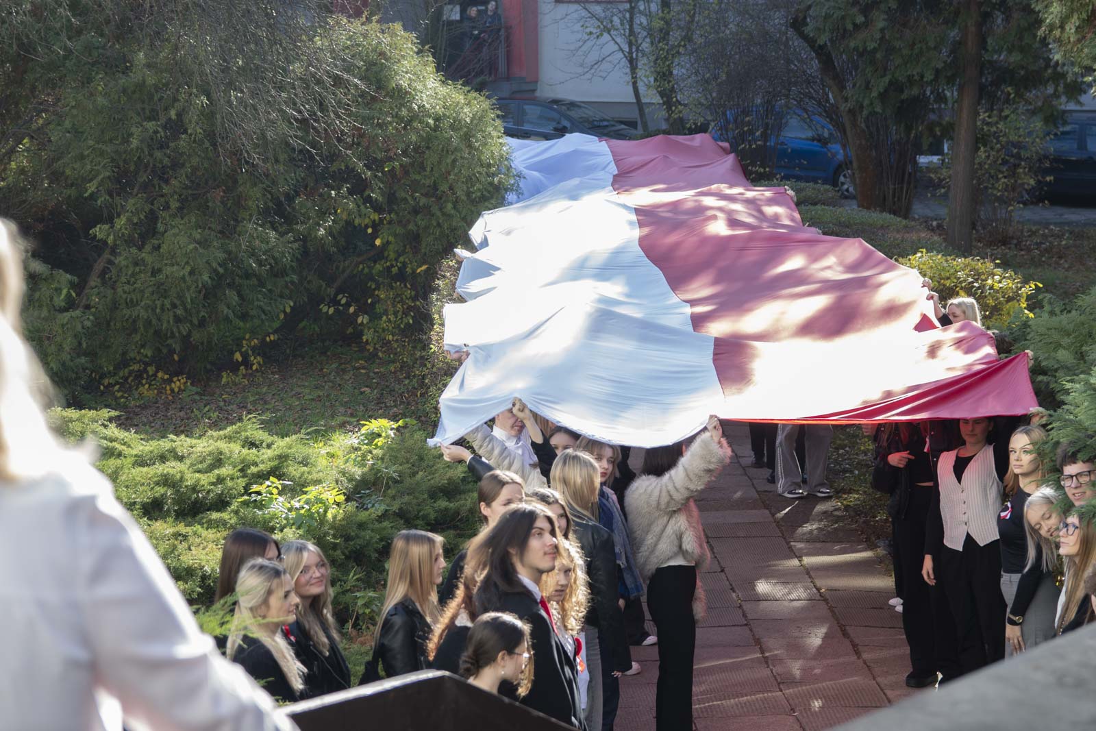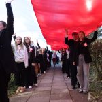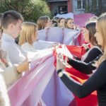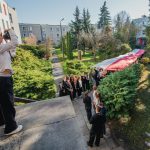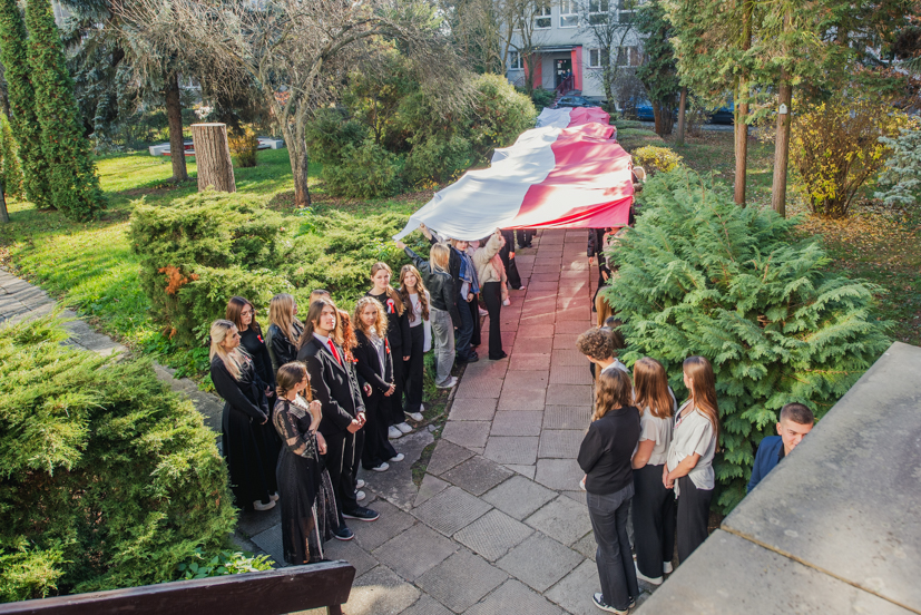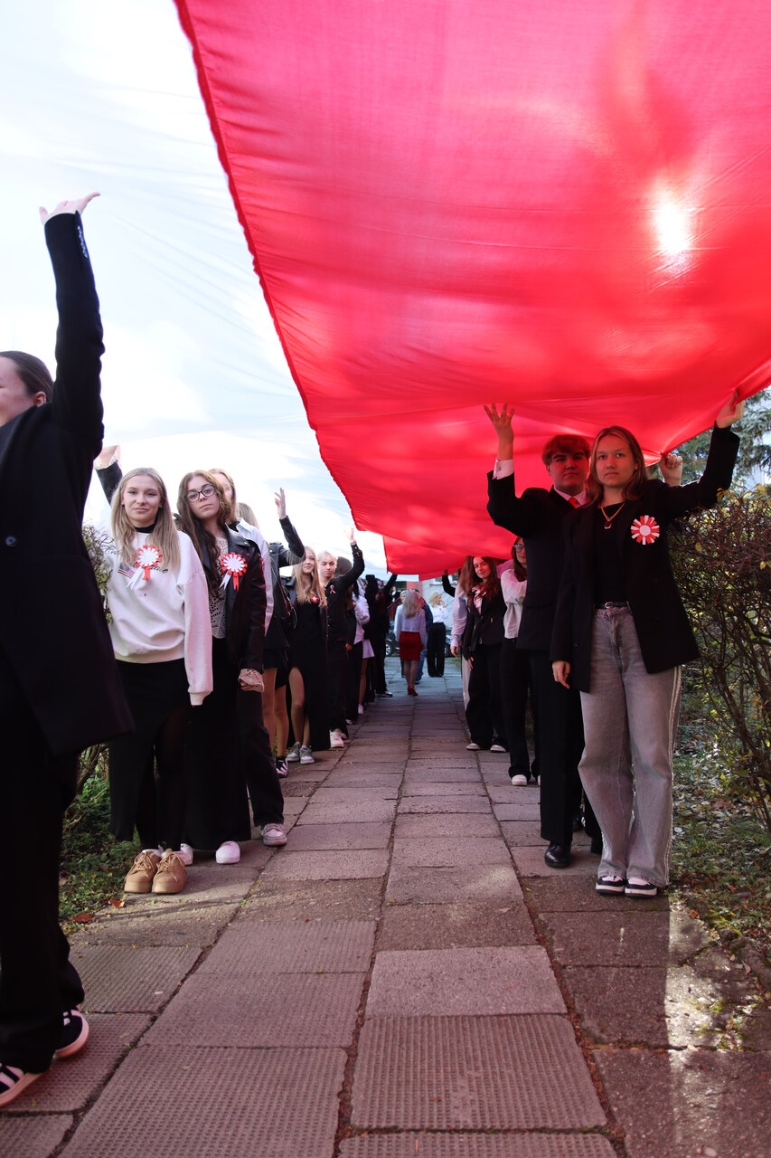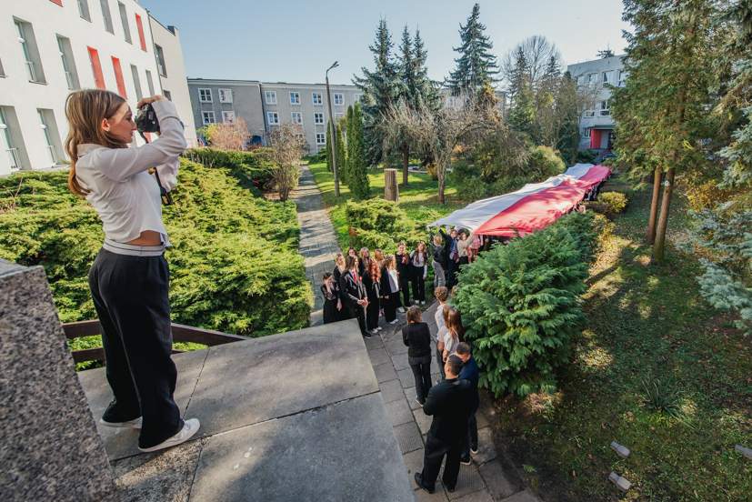 Po hymnie, przedstawiciele klas wyszli na patio szkoły, z uszytą na warsztatach szkolnych specjalnie na tę okazję, 20 – metrową flagę, aby zrobić pamiątkowe zdjęcie.