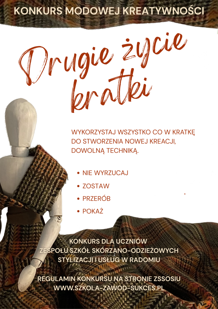 Piąta edycja KONKURSU MODOWEJ KREATYWNOŚCI tym razem zatytułowany „Drugie życie kratki”, koordynowanego przez Panią Renatę Cichoń – nauczyciela Pracowni konfekcjonowania odzieży we współpracy z Panią Anitą Olszewską-Zapłatą – nauczyciela Podstaw projektowania odzieży. Konkurs skierowany jest do wszystkich uczniów ZSSOSiU niezależnie od kierunku kształcenia. Może wziąć w nim udział każdy, kto choć trochę chce rozwinąć i zaprezentować swoją pomysłowość, łącząc ze sobą dwa światy – ekologię i modę. Wystarczy wykorzystać „stare” ubrania, szaliki, koce, narzuty w kratkę by stworzyć nową, kreatywną, niepowtarzalną rzecz.