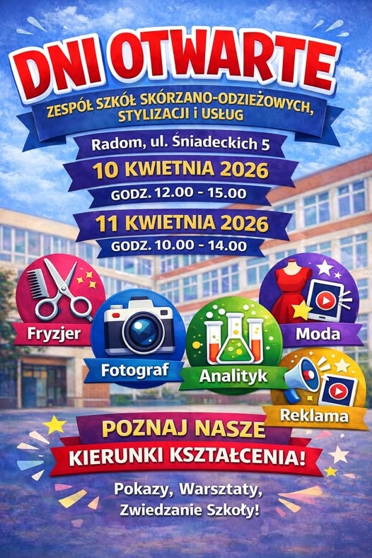 W dniach 10 i 11 kwietnia społeczność szkolna Zespołu Szkół Skórzano-Odzieżowych, Stylizacji i Usług w Radomiu zaprasza uczniów Klas Ósmych Szkół Podstawowych na dni otwarte szkoły.